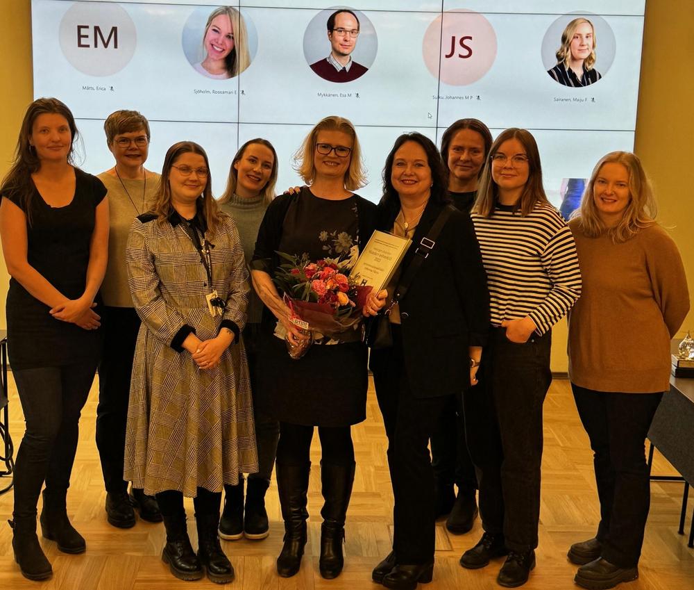 Opintoasiainpäällikkö Johanna Harju ja taustalla alaiset Vaasassa etäyhteydellä sekä paikalle saapuneet häntä esihenkilöksi suositelleet.